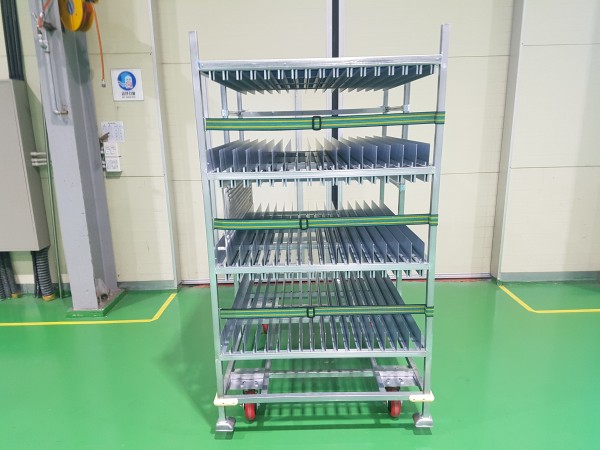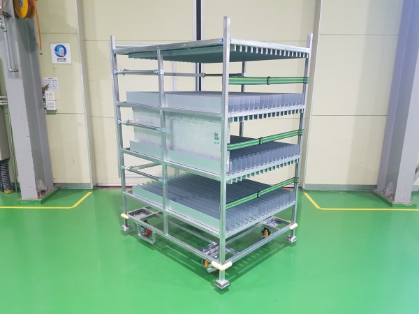 위 대차는 전기차 배터리에 들어가는 COOLING BLOCK을 납품하는 공용대차입니다.(총 3가지 Type의 제품을 적재가능하도록 제작 되었음)