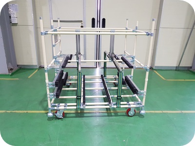 EVA Guide 가변 장치를 적용하여 한 대차에 4가지 Type의 제품을 적재할 수 있도록 설계, 제작 되었습니다.